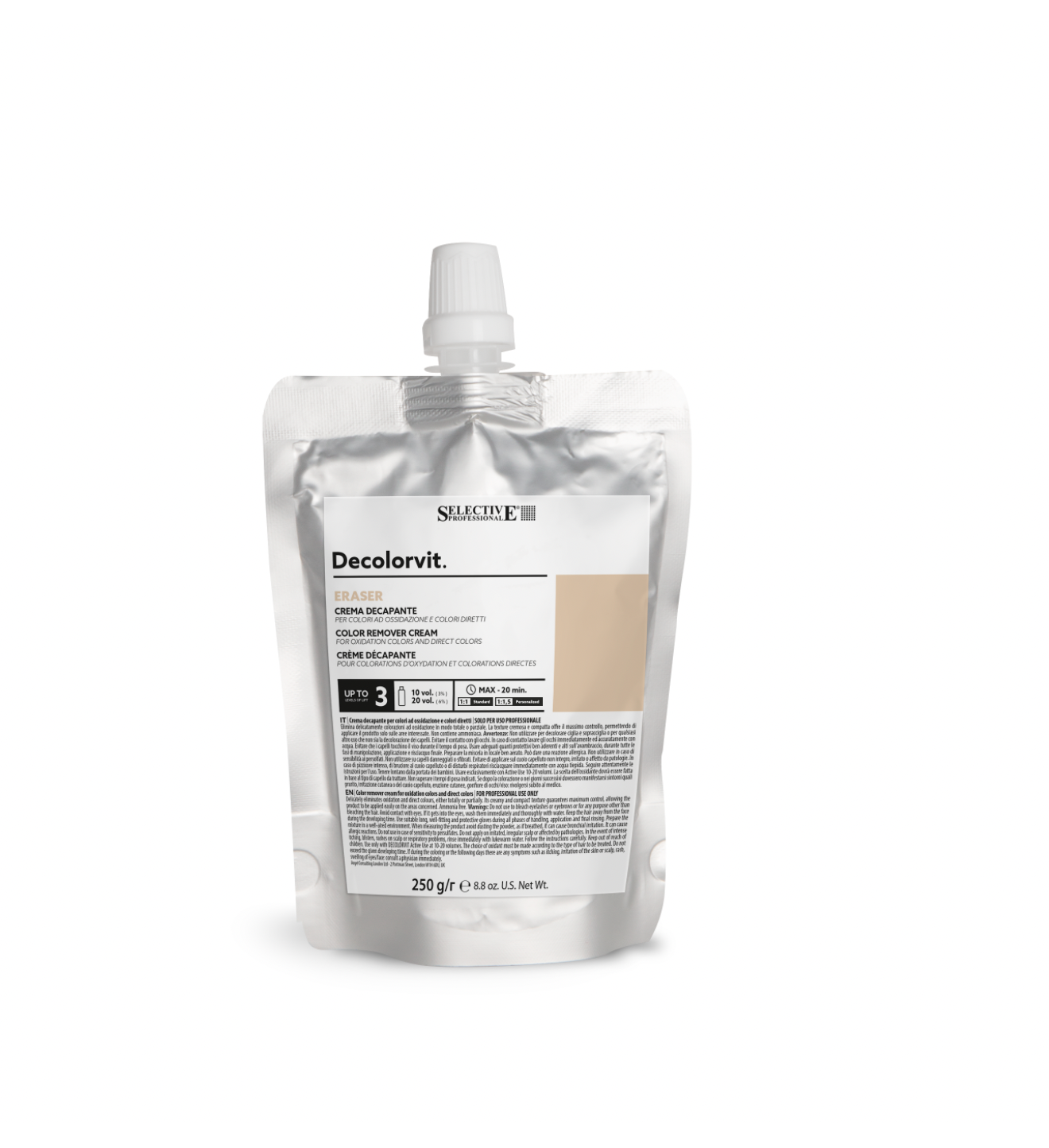 Decolorvit Eraser to krem odbarwiający, opracowany w celu delikatnego usuwania koloryzacji utleniających, w całości lub w części. Kremowa, zwarta konsystencja zapewnia maksymalną kontrolę, umożliwiając nakładanie produktu dokładnie na wybrane obszary. Dzięki zaawansowanej technologii bez amoniaku, bezpiecznie usuwa nawet bezpośrednie pigmenty i zapewnia optymalne rezultaty już po jednym zastosowaniu. Działa stopniowo i szybko. Umożliwia rozjaśnienie włosów do 3 poziomów z pełnym poszanowaniem struktury włosa.