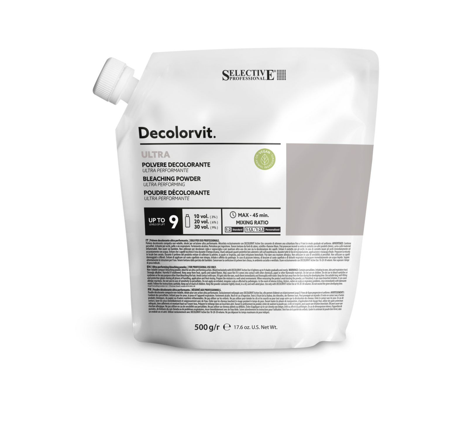 Decolorvit Ultra to wysokowydajny puder odbarwiający o dużej mocy rozjaśniania. Technologia Pullulex wzmacnia ochronę włosów podczas wykonywania usługi technicznej i umożliwia osiągnięcie nieskazitelnych rezultatów nawet przy najciemniejszych bazach. Niezwykle wszechstronny, zapewnia równomierne, długotrwałe odbarwienie oraz minimalizuje łamanie się włosów. Zaawansowana formuła z jednoczesnym odbudowaniem oddziałuje od wnętrza na zewnątrz struktury włosa, umożliwiając uzyskanie świetlistych blondów i miękkich włosów.